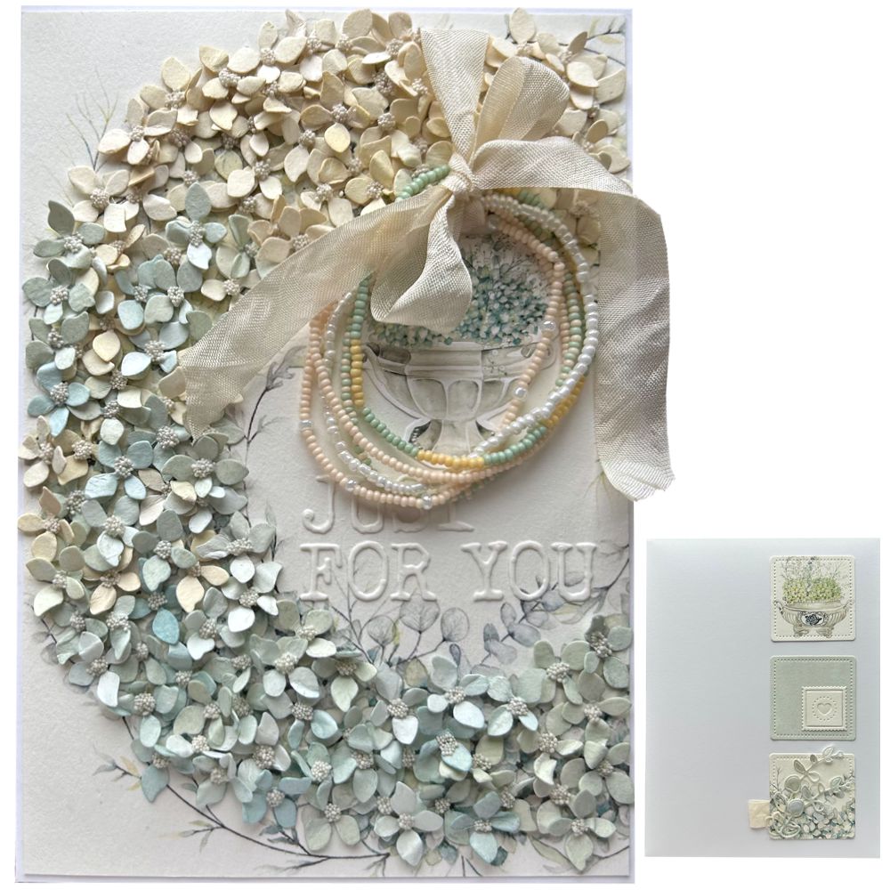 Základ je rozevírací papírové přání (bílé, gramáž papíru 300g). Dekorace z papíru, doplnĕná mašličkou a dárkem: 5 ručně vrobených korálkových náramků ø 16 cm. Korálky jsou navlečeny na gumičce. Barvy v odstínech pastelových.