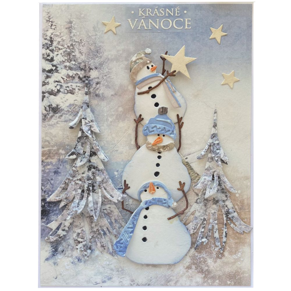 Vánoční přáníčko se sněhuláky. Nejmenší přidává hvězdu na oblohu.