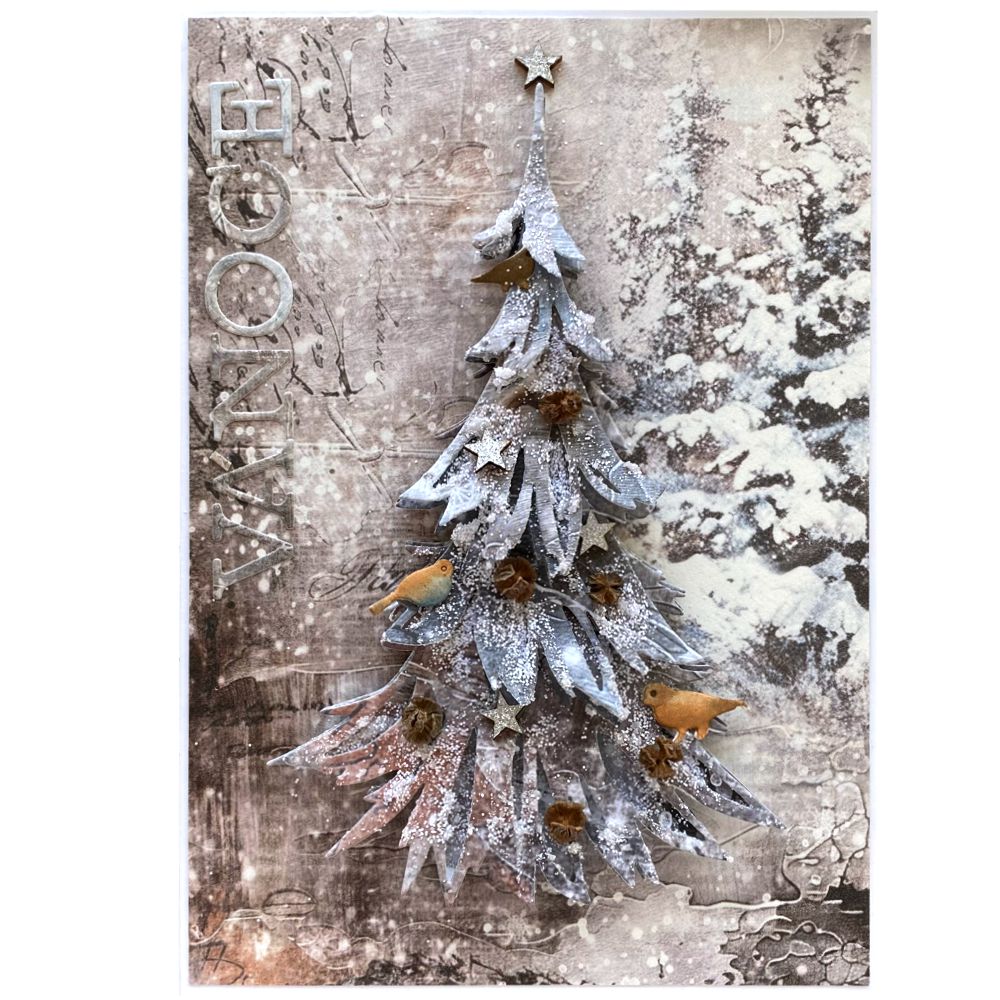 Vánoční přáníčko se zasněženým stromem s ptáčky. Doplněny malé opravdové šišky.