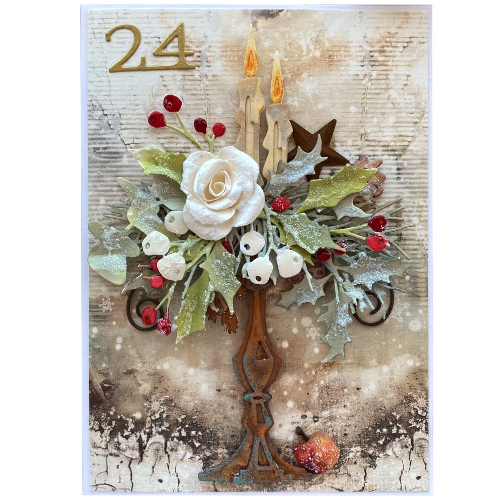 Základ je rozevírací papírové přání (bílé, gramáž papíru 300g). Papírová dekorace.
