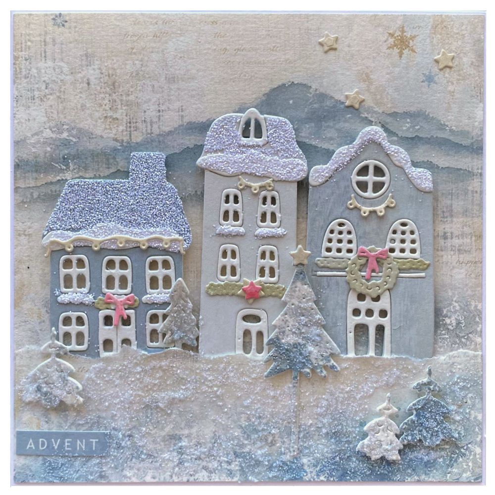 Přáníčko k Vánocům s domečky v jemných modrých tónech zasněžené.