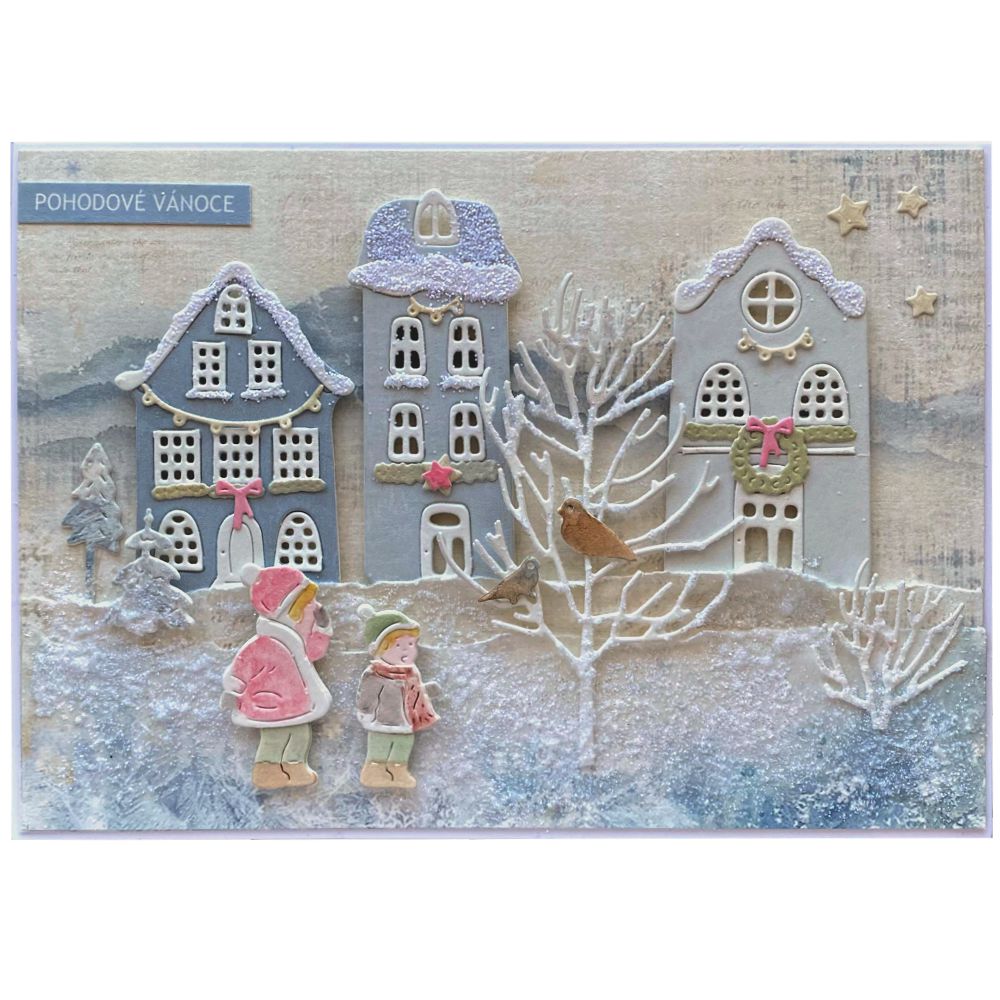 Přáníčko k Vánocům s domečky v jemných modrých tónech zasněžené.