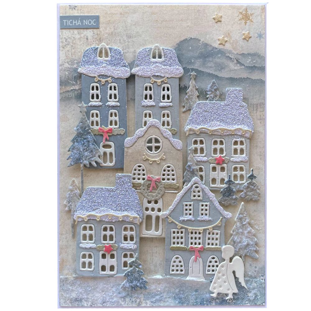 Přáníčko k Vánocům s domečky v jemných modrých tónech zasněžené.