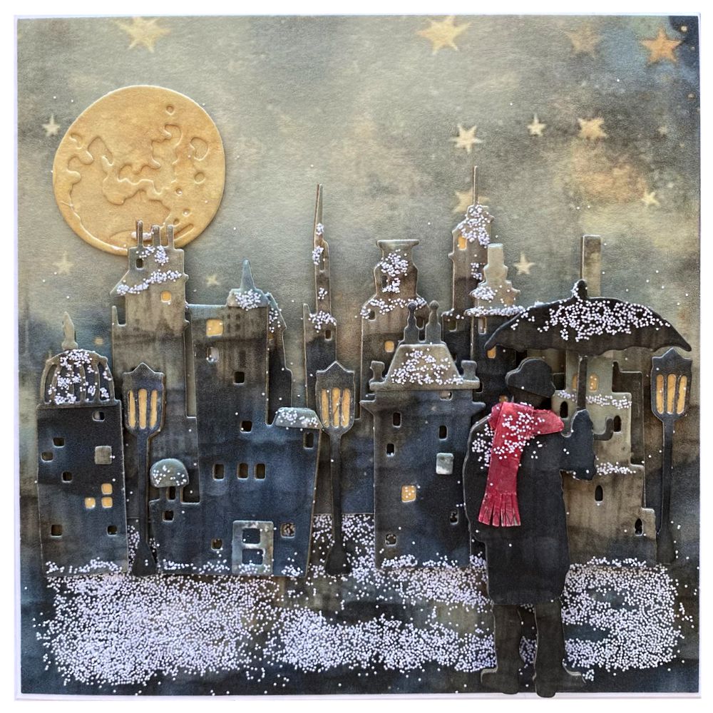 Přáníčko k Vánocům město s domy v noci zasněžené.