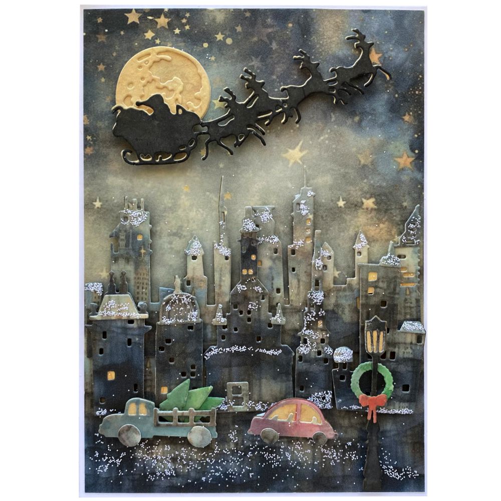 Přáníčko k Vánocům město s domy v noci zasněžené.